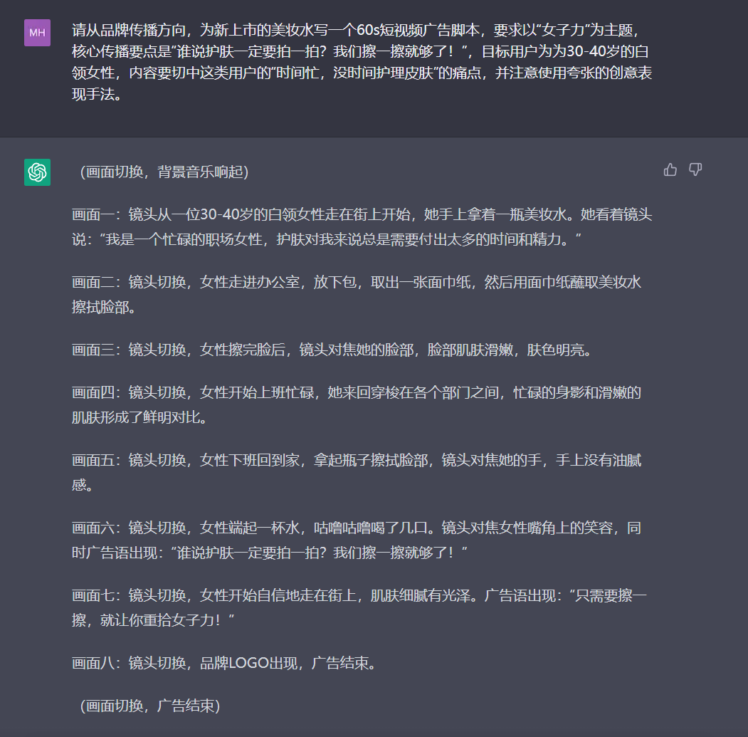 3、请从品牌传播方向,为新上市的美妆水写一个60s短视频广告脚本,要求以“女子力”为主题,核心传播要点是“谁说护肤一定要拍一拍?我们擦一擦就够了!”,目标用户为30-40岁的白领女性,内容要切中这类用户的“时间忙,没时间护理皮肤”的痛点,并注意使用夸张的创意表现手法。