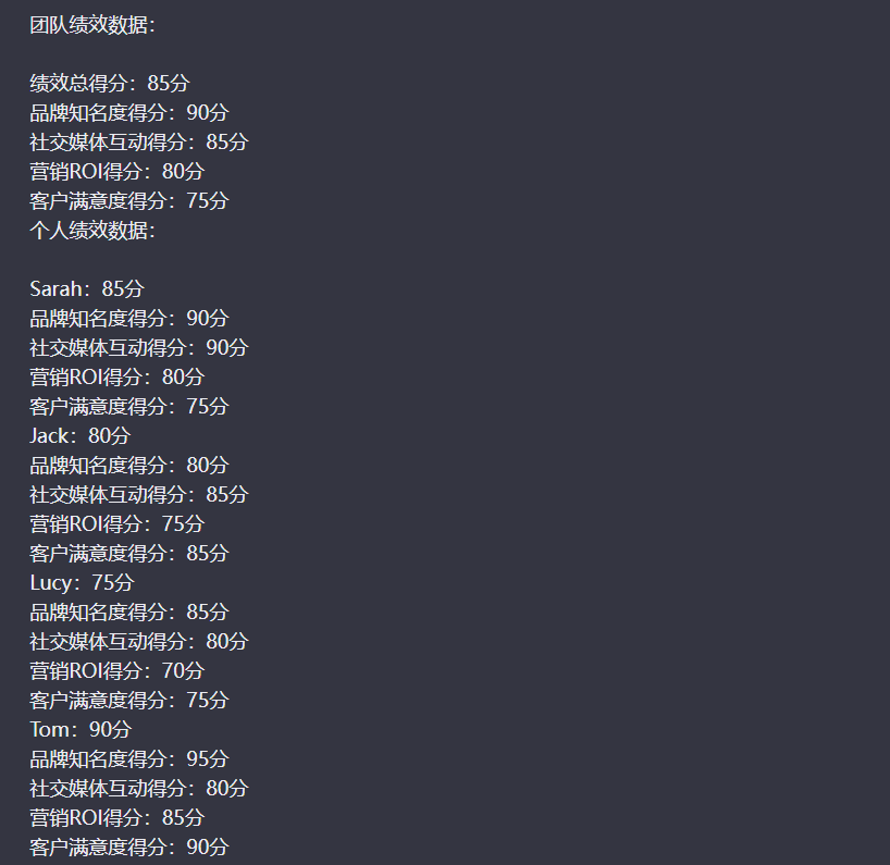 问题输入1:团队包含4人,分别是Tom、Sarah、Jack、Lucy,绩效如下: